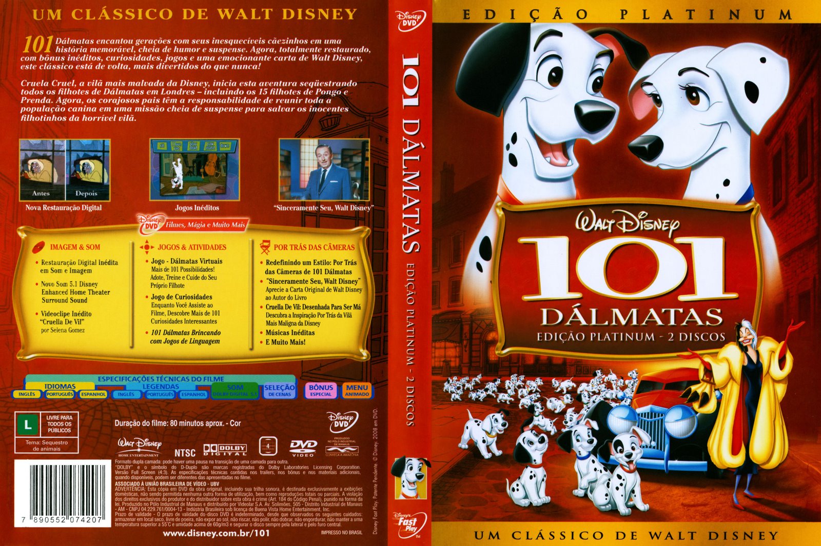 Sinopse: Um adorável grupo de cachorrinhos, um cenário encantador da antiga cidade de Londres, uma cruel vilã e uma espetacular animação fazem de 101 Dálmatas um dos maiores clássicos de Walt Disney de todos os tempos. Agora pela primeira vez em DVD duplo com imagem e som restaurados comemorando a sua Edição Platinum. A diversão começa quando os dálmatas Pongo e Prenda tem 15 maravilhosos filhotes na casa de seus donos. Juntos eles formam uma grande e linda família até que a malvada Cruela Cruel rapta todos os filhotes da dálmatas da cidade, incluindo os de Pongo e Prenda. Agora, os corajosos pais tem a responsabilidade de reunir toda a população canina, em uma missão cheia de suspense para salvar os inocentes filhotinhos da horrível vilã.