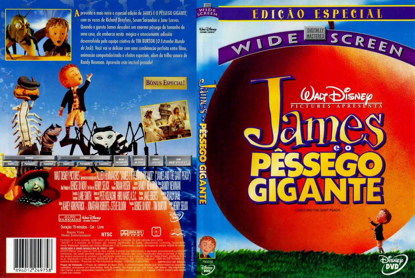 Sinopse: Aproveite a mais nova e especial edição de James e o Pêssego Gigante, com as vozes de Richard Dreyfuss, Susan Sarandon e Jane Leeves. Quando o garoto James descobre um enorme pêssego do tamanho de uma casa, ele embarca nesta mágica e emocionante odisséia desenvolvida pela equipe criativa de Tim Burton (O Estranho Mundo de Jack). Você vai se deliciar com uma combinação perfeita entre filme, animação computadorizada e efeitos especiais, além da trilha sonora de Randy Newman. Aproveite esta incrível jornada.