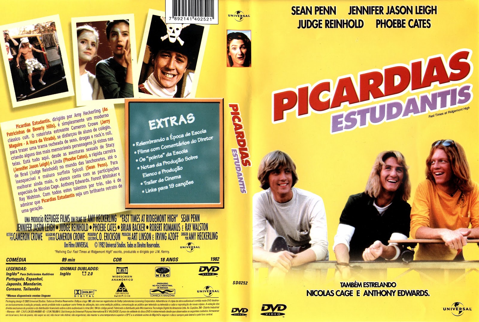 Sinopse: Picardias Estudantis, dirigido poe Amy Heckerling (As Patricinhas de Beverly Hills) é simplesmente um moderno clássico cult. O roteirista estreante Cameron Crowe (Jerry Maguire – A Hora da Virada), se disfarçou de aluno de colégio para trazer uma trama recheada de sexo, drogas e rock and roll, criando alguns doa mais memoráveis personagens já vistos nas telas. Está tudo aqui, desde as aventuras sexuais de Stacy (Jennifer Jason Leigh) e Linda (Phoebe Cates), a rápida carreira de Brad (Judge Reinhold) no mundo das lanchonetes, até o inesquecível e maluco surfista Spicoli (Sean Penn). Para melhorar ainda mais, o elenco conta com as participações especiais de Nicolas Cage, Anthony Edwards, Forest Whitaker e Ray Waltson. Com todos estes talentos por trás, não é de admirar que Picardias Estudantis seja um brilhante retrato de uma geração.